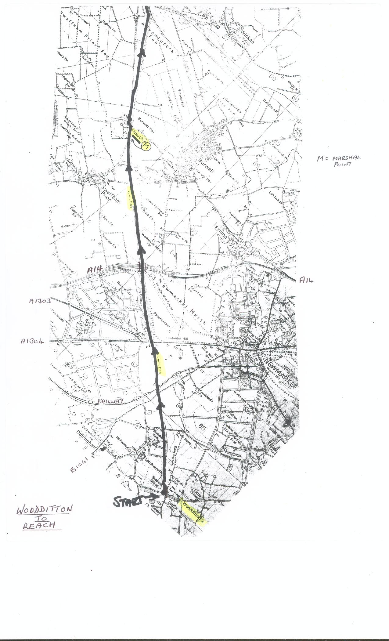 Route Description Transport to Woodditton (about 50 yards past the water tower corner) to start at public footpath sign. Follow public FP between gardens and then diagonally across field (view of distant Ely Cathedral on a clear day) and alongside wood to corner of field to track in woods on east side of Devil’s Ditch. Follow Devil's Ditch via Newmarket Racecourse and across A14 to Reach (1st checkpoint 7.5 miles). At end of Reach Green, take 'The Hythe' lane to left of chapel. Follow to FP bridge on left across Reach Lode. After crossing FP bridge, turn right on track and across style to meadows with lode on right. Follow track along Reach Lode bank to Upware Sluice (10.5m). Turn right over sluice and first left along lode bank to pub. Turn right after pub and then left at FP sign across meadow. Left after meadow and follow track (bears right around arable field to wood). Continue along side of wood to end and turn left along grassy track with wood on left. Follow grassy track (muddy towards end) to A1123 at 'chalk pit' lime works. Cross A1123 to (2nd checkpoint 12.3 miles at 'Chalk Pit'). Follow track across 'Kingfisher' humpback bridge and turn left shortly afterwards on FP (just before track T-junction) and follow to riverbank. Follow Cam/Gt Ouse east bank to the pump house at Lode Bridge near Barway. Continue along east riverbank (under railway bridge) to Stuntney Road. Turn left across Ely High Bridge, then right down riverside FP to The Cutter. Left up Jubilee Gardens to Broad Street. Cross Broad Street to the Park hill and turn right at top to back of Cathedral and to Paradise.
